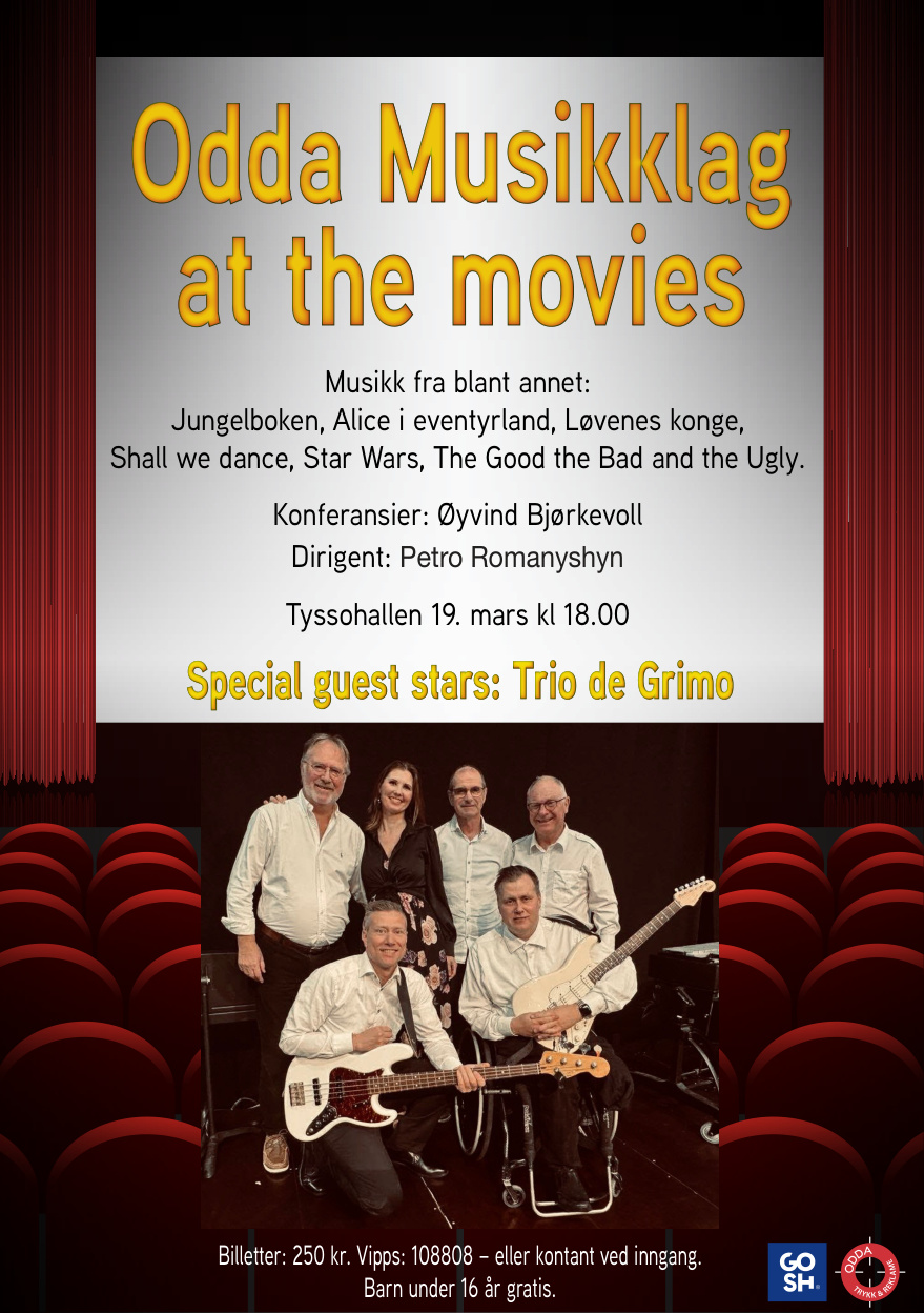 Torsdag 19. mars klokka 18.00 vert det konsert med Odda Musikklag i Tyssohallen. Tema for konserten er filmmusikk.
